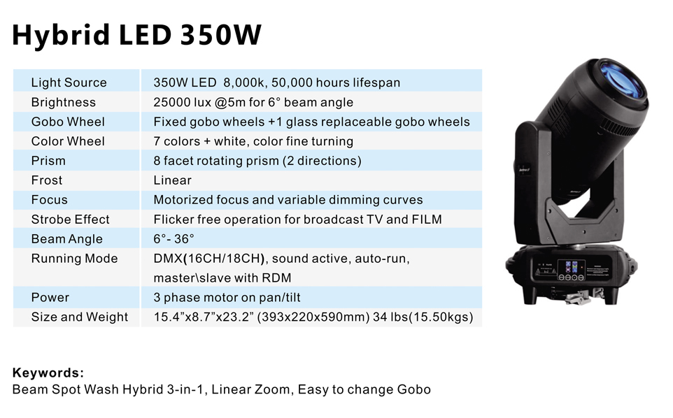 Hybrid LED 350w is powered by LED 350w lamp, Beas Spot Wash 3-in-1Parameter
